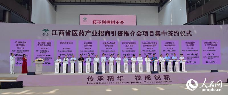 大会开幕现场,还举办了江西省医药产业招商引资推介会,10个项目现场签约。人民网记者 时雨摄
